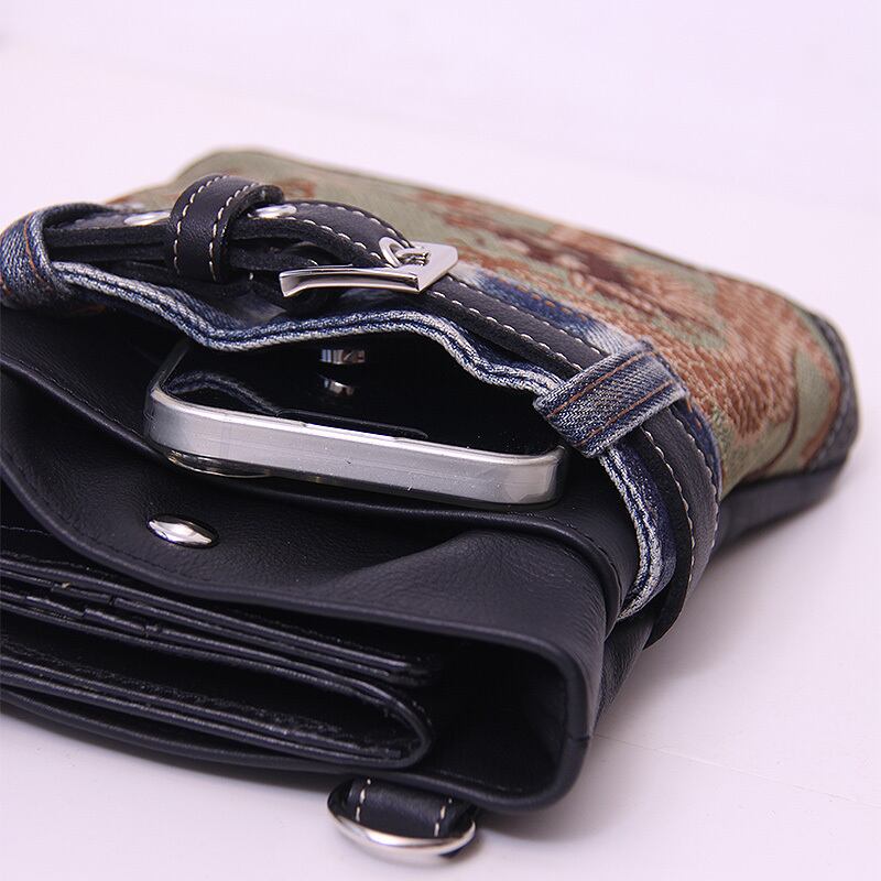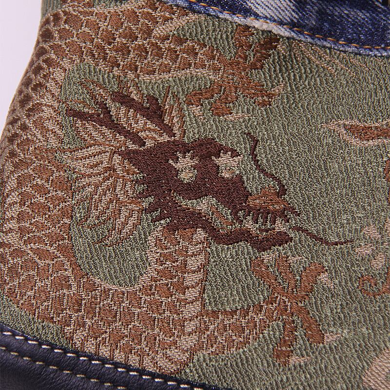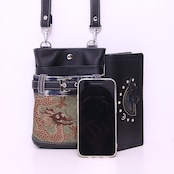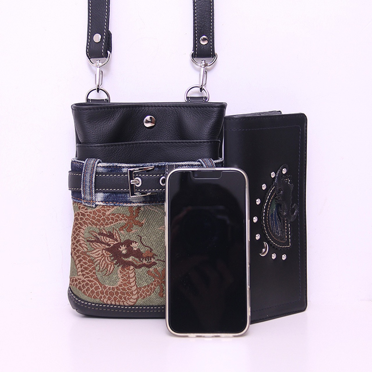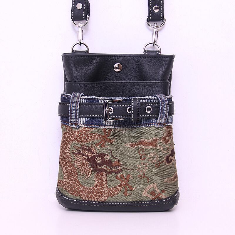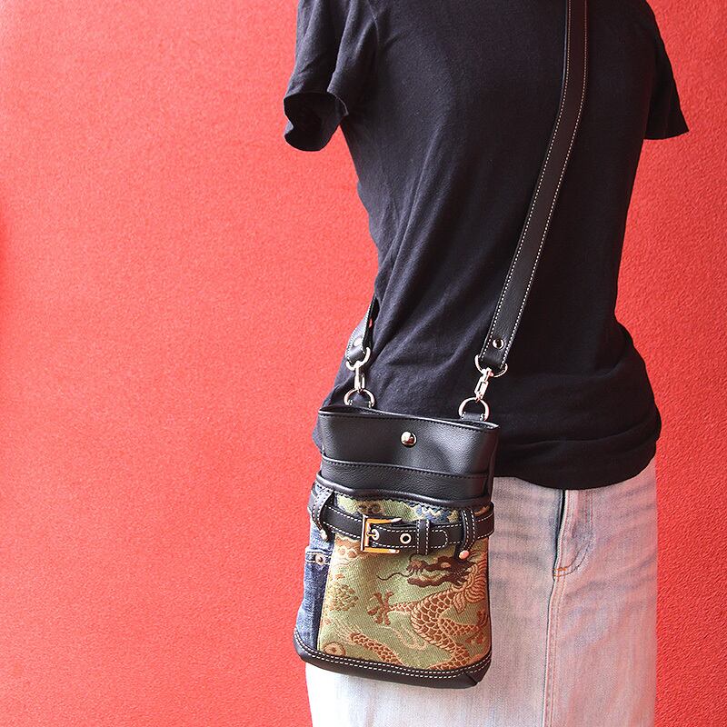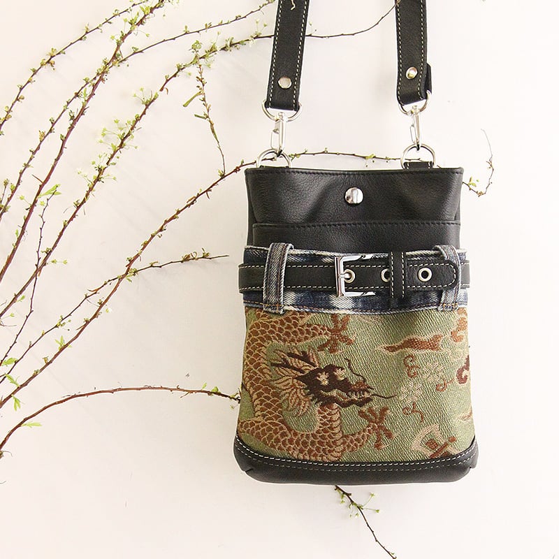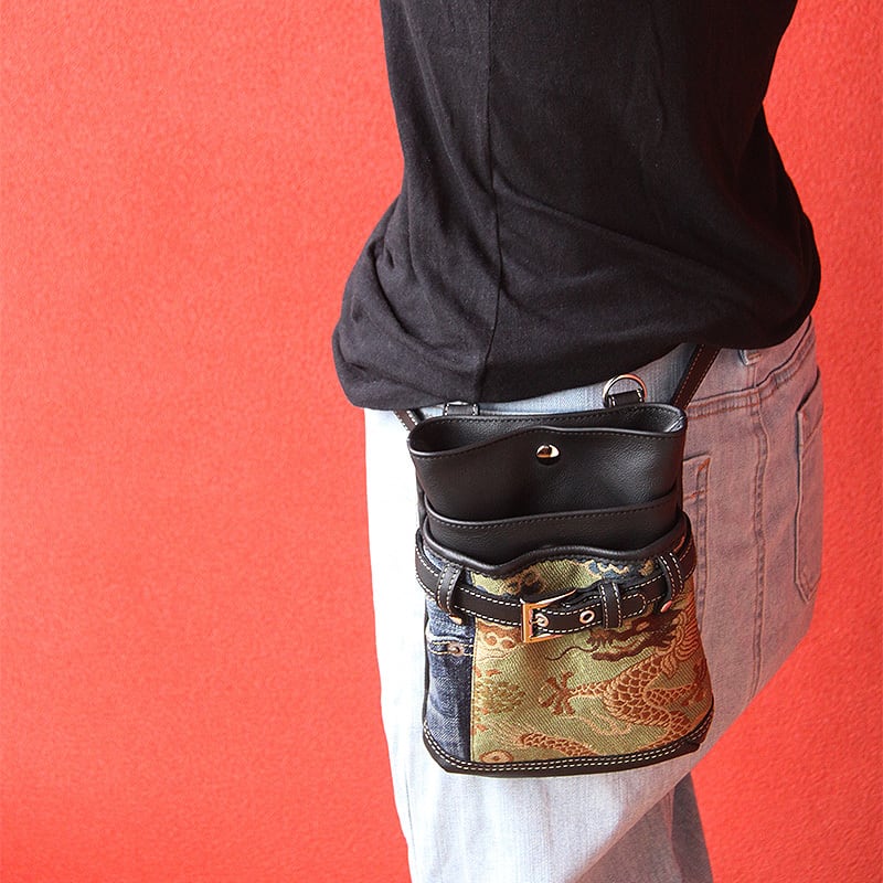 ファンキーな龍の帯とユーズドデニムを組み合わせたシザーバッグ。